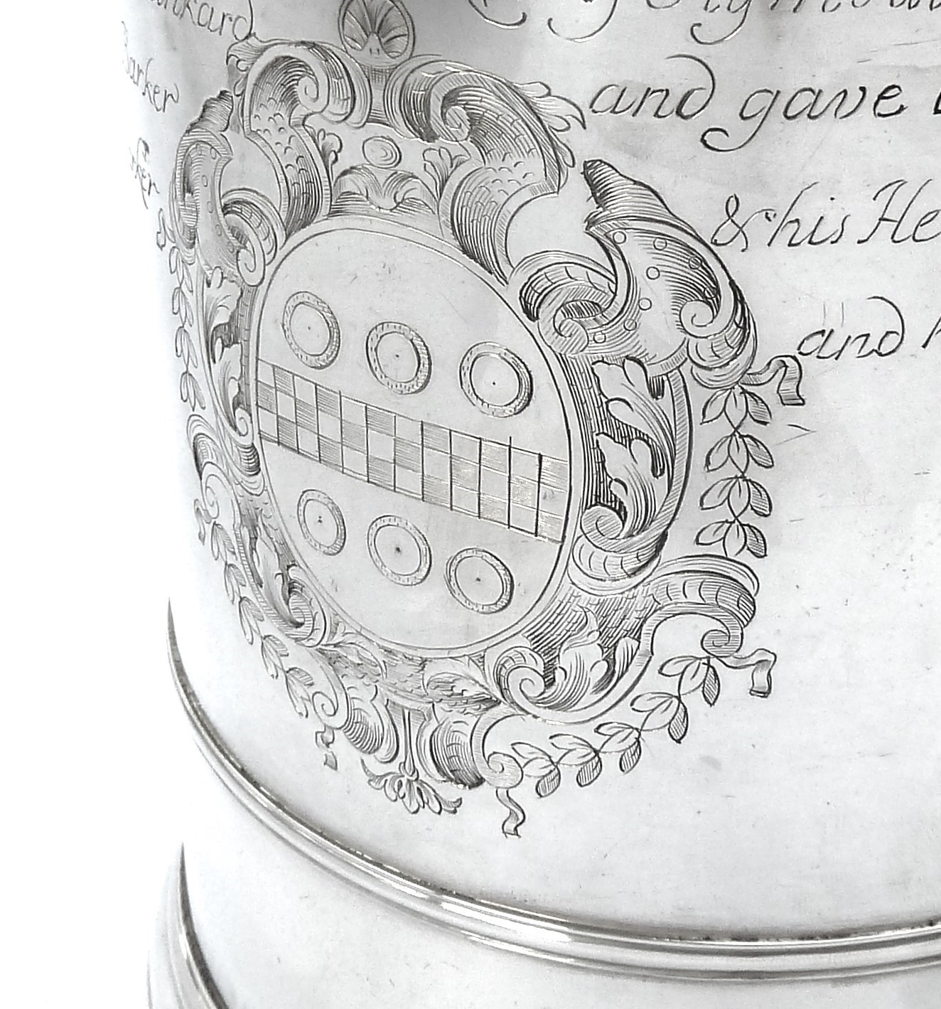 The large tapering cylindrical body upon a moulded and threaded skirted base. The sides applied with a reeded girdle a quarter of the way up and the sizeable "S" scroll handle with plain reeded rat-tail descending from a wedge-shaped bracket with transverse graduated fluting. The lower part of the handle with plain shield applied to a cut-card panel of wavy lozenge shape. The flat topped lid with cast chairback thumbpiece with extra central scroll . The flattened edges to the lid with reeded bands and wavy cut front below curved rising sides with stepped top. The upper part of the body engraved with contemporary armorials within baroque mantling of shaded and scaled symmetrical scrolls and draped with pretty garlands of leaves, all below a four line dedication. The Inscription reads: "To Preserve the Memory of Daniel Barker of Plymouth Mercht. Gregory Barker out of a Legacy He Bequeathed to Him, Purchased This Tankard and Gave it to His Son Pentecost Barker & His Heirs Male, And in Default of Such, Then to His Daughter Susanna Barker and Her Heirs Forever."