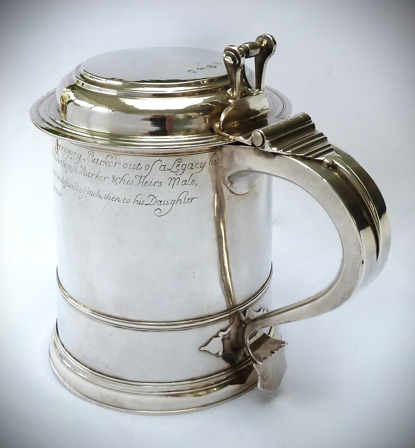 Daniel Barker (1622-1693) bequeathed in his will the sum of £25 to Gregory Barker (National Archives, Kew, 11/418/218). It is reasonable, therefore, to assume that Gregory spent part of this to commission a large tankard from the London silversmith Timothy Ley in 1705 as cited in the inscription.