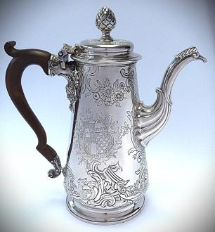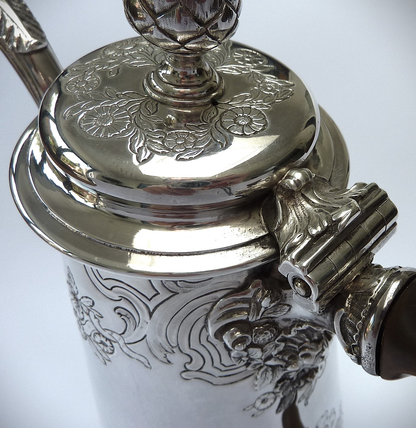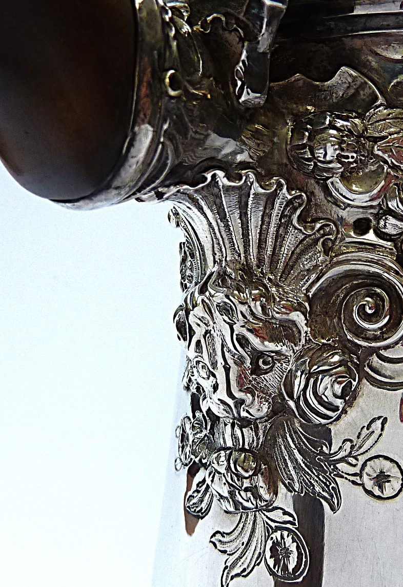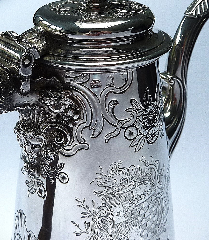 Of tapering cylindrical form with tucked-in base and small plain spreading foot. The lower part of the body chased with dragons, bold scrolls, fluted panels and foliage. The bottom support to the double scroll fruitwood handle with a delicate 6-petal flower head applied to the body amidst a matted crustacean reserve surrounded by rocaille shells and fluted scrolls. The upper handle support applied to the body above a superb cast and chased emerging lion capped by a decorative fluted shell enclosed within further scrolls, flowers and leaves. The cast part-fluted swan-neck spout surrounded by more shell work, scrolls and foliage and the upper part of the body with bouquets of flowers flanked by "C" scrolls and shells. The hinge unusually applied with a cast shell and the flattened domed lid with further foliate chasing surrounding a large bud finial. The right side of the handle engraved with stylish armorials in the asymmetric rococo style encased by leaves,scrolls and shell work.
