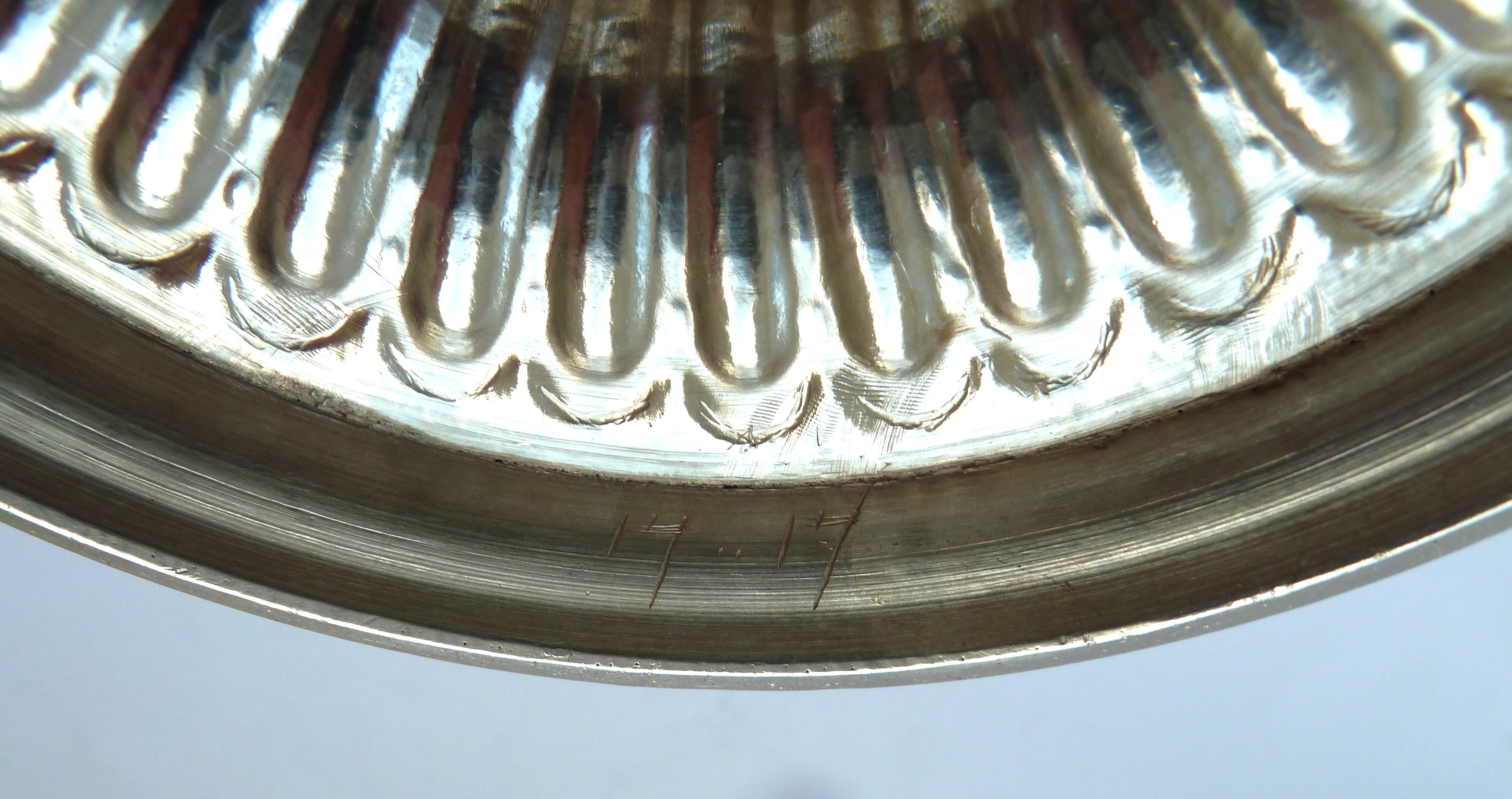 The circular hemispherical bowl embossed with swags around the sides separated by 4 tied garlands. The lower part with an embossed calyx of acanthus leaves and the rim with beaded border. The spreading foot fluted and bordered by large beading.