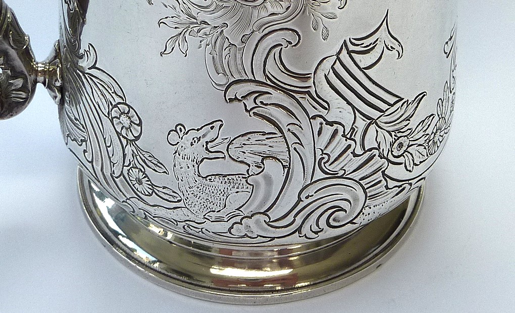 Of tapering cylindrical form with tucked-in base and small plain spreading foot. The lower part of the body chased with dragons, bold scrolls, fluted panels and foliage. The bottom support to the double scroll fruitwood handle with a delicate 6-petal flower head applied to the body amidst a matted crustacean reserve surrounded by rocaille shells and fluted scrolls. The upper handle support applied to the body above a superb cast and chased emerging lion capped by a decorative fluted shell enclosed within further scrolls, flowers and leaves. The cast part-fluted swan-neck spout surrounded by more shell work, scrolls and foliage and the upper part of the body with bouquets of flowers flanked by "C" scrolls and shells. The hinge unusually applied with a cast shell and the flattened domed lid with further foliate chasing surrounding a large bud finial. The right side of the handle engraved with stylish armorials in the asymmetric rococo style encased by leaves,scrolls and shell work.