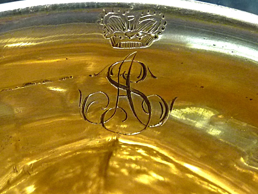 The interior has the interesting monogram of AS beneath a crown. The latter appears to be the Imperial State Crown and coupled with the monogram there may be some connection to Prince Albert, husband of Queen Victoria. Although Albert died in 1861 the date of the stirrup cup may be significant in that it signified the Golden Jubilee of Victoria's reign and the 30th anniversary that Albert was made Prince Consort, The initials AS beneath a crown appear in a number of places in the Victoria and Albert Museum representing Albert of Saxe-Coburg.