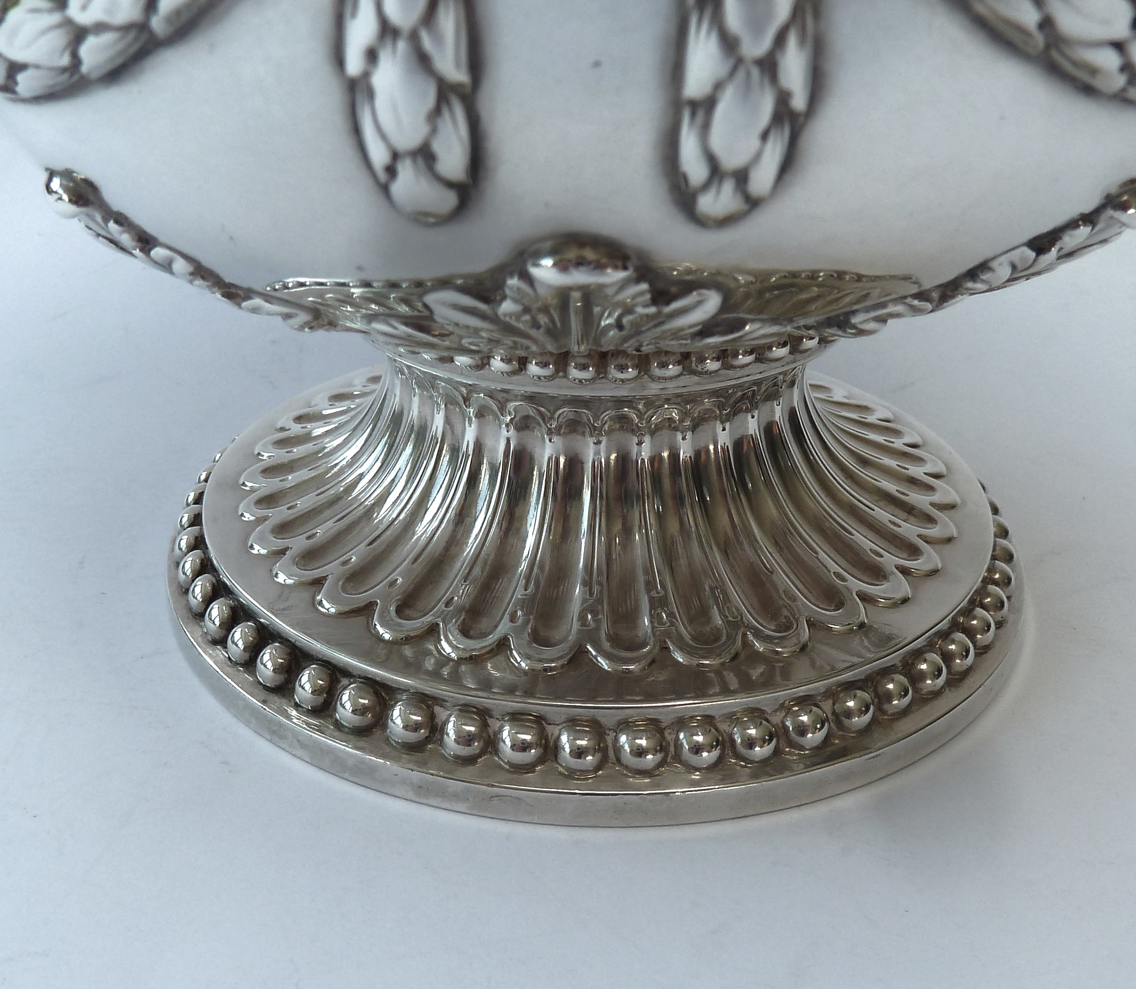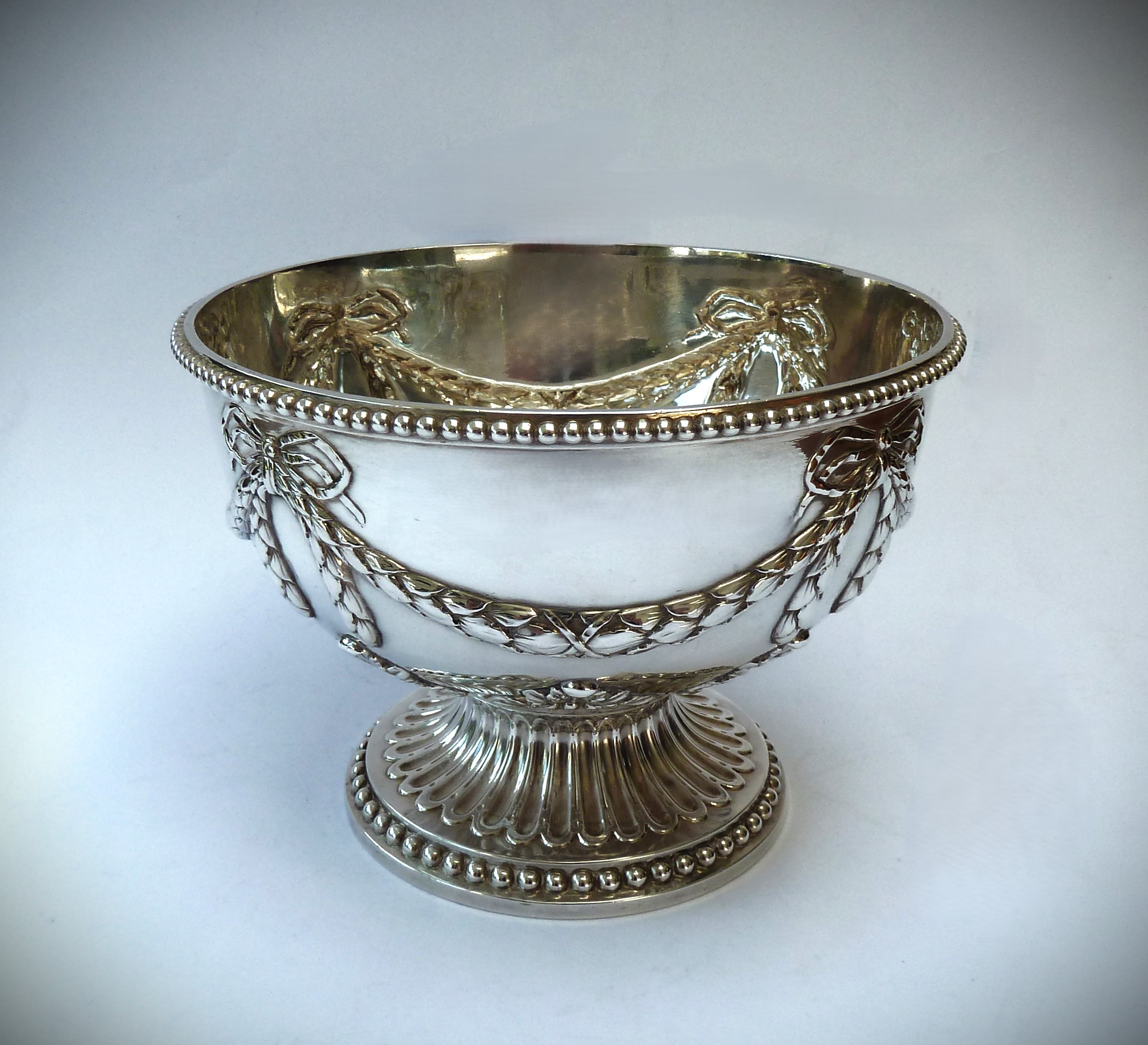 The circular hemispherical bowl embossed with swags around the sides separated by 4 tied garlands. The lower part with an embossed calyx of acanthus leaves and the rim with beaded border. The spreading foot fluted and bordered by large beading.